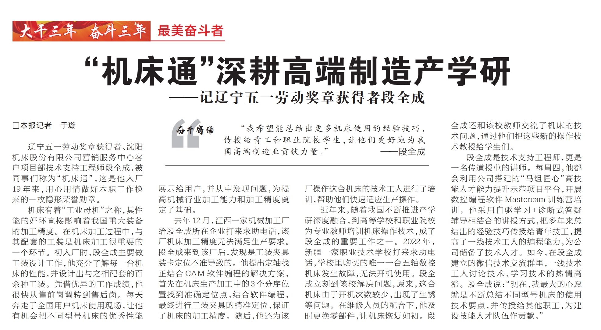 段全成,沈陽機床股份有限公司營銷服務中心客戶項目部技術支持工程師,獲得遼寧五一勞動獎章、沈陽五一勞動獎章等多項榮譽。遼寧工人報社以“機床通”深耕高端制造產學研為題,講述了他入廠19年來,用心用情做好本職工作,同時把多年來總結出的經驗技巧傳授給青年技工,提高了一線技術工人的編程能力,為公司儲備了技術人才,為建設技能人才隊伍作貢獻的優秀事跡。